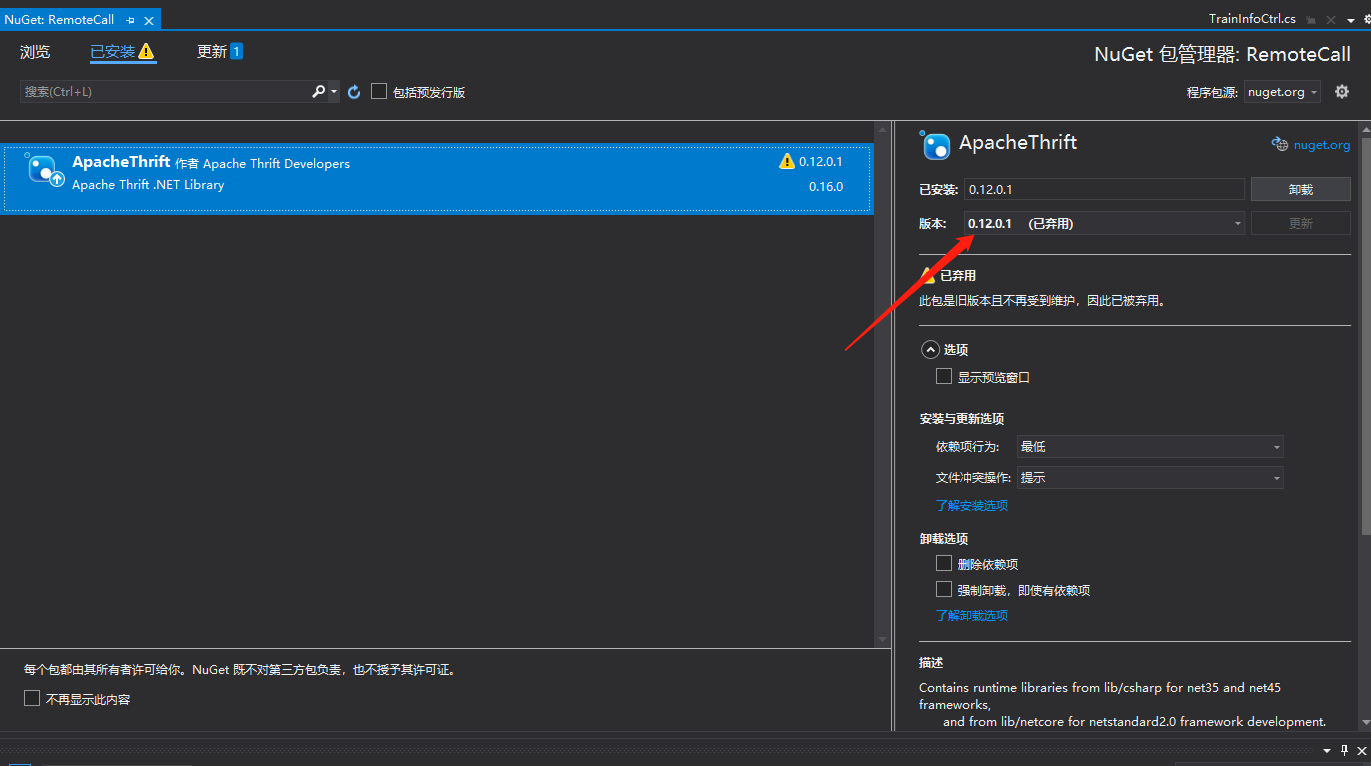 使用NuGet包管理工具,下载安装对应的thrift的包